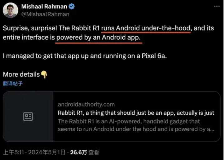 在产品宣传时,CEO吕骋表示,RabbitR1搭载的是全新操作系统RabbitOS,比Android好用数倍。结果被Android专家MishaalRahman爆出整个产品就是套壳Android的产物。